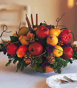 Apples, pears and cinnamon sticks, along with fresh evergreens and pinecones, arrive in a terra-cotta pot.Approx. 28 W x 13 H